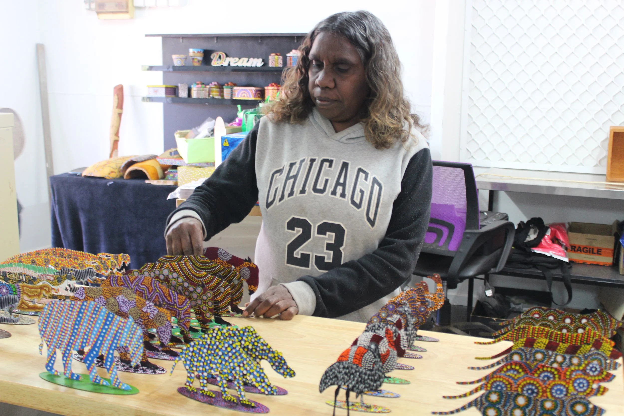 The artworks created by our talented local artists reflect a deep connection to land, culture, and history. Drawing inspiration from the surrounding desert landscape, common themes explored at Engawala include: