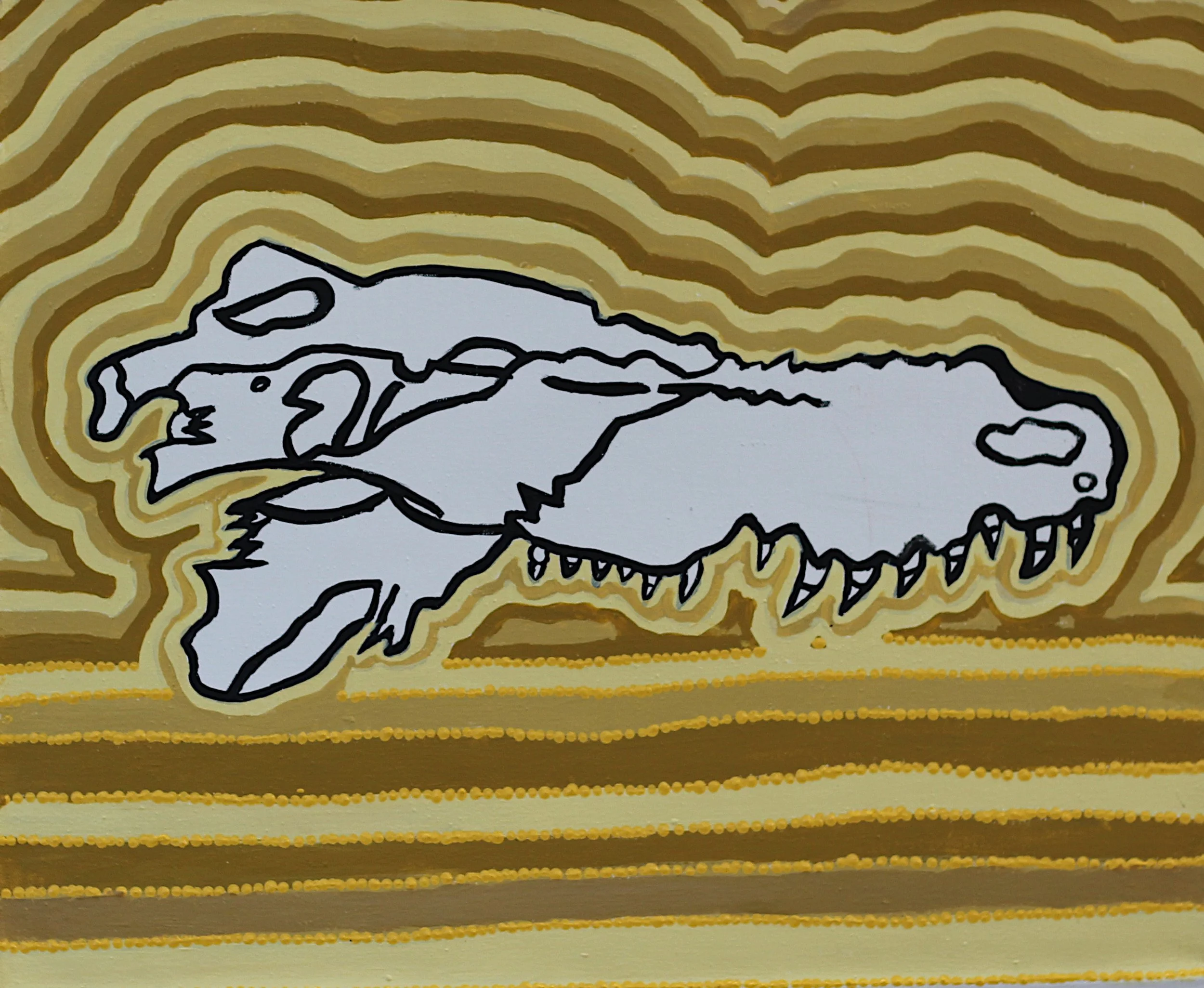 At the Engawala Art Centre many of the artists, including Bronwyn, use mega fauna as subjects in their paintings and other artworks. A common image the artists use is that of dromornis stirtoni an ostrich like bird with a massive bill. A representation of it can be seen on the floor of the Art Centre, painted by local artists.